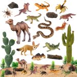 - 【Desert Reptiles Animal Figures】- 32pcs desert habitant playset includes 2pcs large cactuses, 1pc simulated wood and 2pcs Rock, 12pcs grasses and 15pcs non-repeating plastic desert animals: Camel, Fennec Fox, Rattlesnake, Lizards, Scorpion, Centipede, Spiders, which have vibrant colors, natural appearance, active poses, each animal figure is finely hand painted and sculpted by experts.